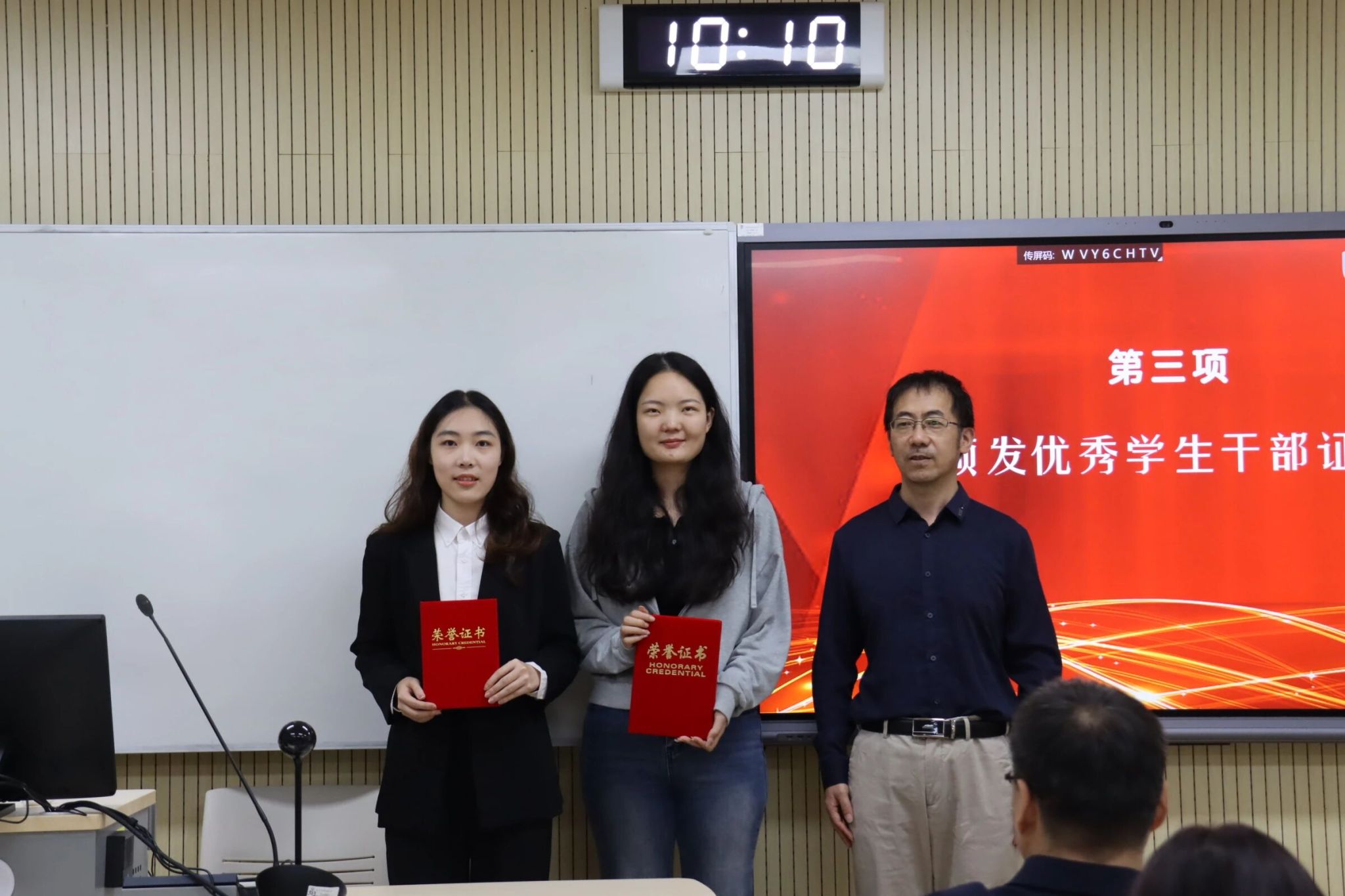 会上,王浩为荣获优秀学生干部荣誉的吕瑶瑶、于洋和荣获优秀安全员荣誉的李子芳颁发证书。